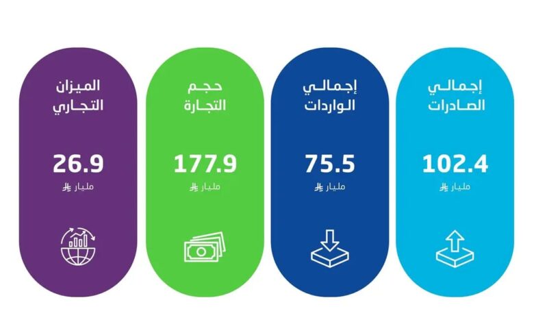 وأوضحت النتائج أن الصادرات البترولية انخفضت بنسبة (0.7%) خلال الفترة نفسها، لتتراجع نسبتها من إجمالي الصادرات السلعية من (72.8%) في يوليو 2024م إلى (67.1%) في يوليو 2025م, وعلى صعيد الميزان التجاري ارتفع الفائض بنسبة (53.4%) مقارنةً بشهر يوليو 2024م، مدفوعًا بانخفاض الواردات بنسبة (2.5%).