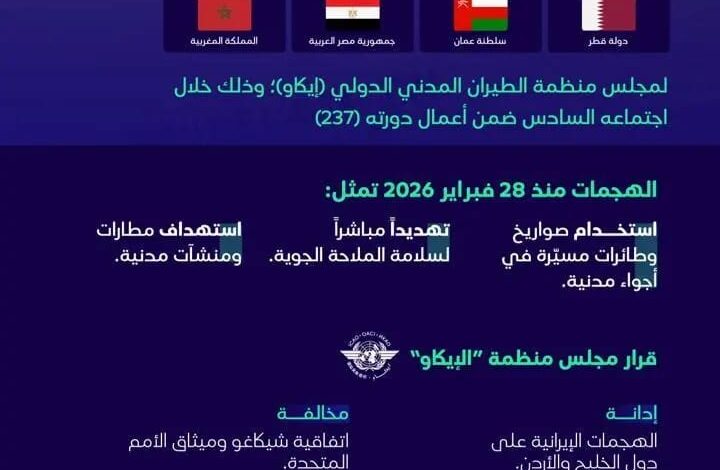 أصدر مجلس منظمة الطيران المدني الدولي (إيكاو)، خلال اجتماعه السادس ضمن أعمال دورته (237)، قرارًا يدين الهجمات التي تشنها إيران على عدد من دول المنطقة، وذلك بناءً على ورقة عمل مشتركة تقدمت بها المملكة العربية السعودية، والإمارات العربية المتحدة، والمملكة الأردنية الهاشمية، ومملكة البحرين، ودولة الكويت، ودولة قطر، وسلطنة عمان، وجمهورية مصر العربية، والمملكة المغربية، بتاريخ 19 مارس 2026م، في خطوة تعكس موقفًا دوليًا حازمًا تجاه التهديدات التي تمس سلامة وأمن الطيران المدني.