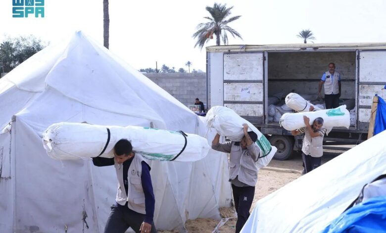 وزع مركز الملك سلمان للإغاثة والأعمال الإنسانية اليوم، عبر الشريك المنفذ المركز السعودي للثقافة والتراث مساعدات إيوائية جديدة تشتمل على كميات كبيرة من الخيام للأسر النازحة التي فقدت منازلها جراء الأزمة الإنسانية في جنوب قطاع غزة، تقيهم من منخفض جوي المصحوب برياح شديدة وأمطار غزيرة، وذلك ضمن الحملة الشعبية السعودية لإغاثة الشعب الفلسطيني الشقيق.